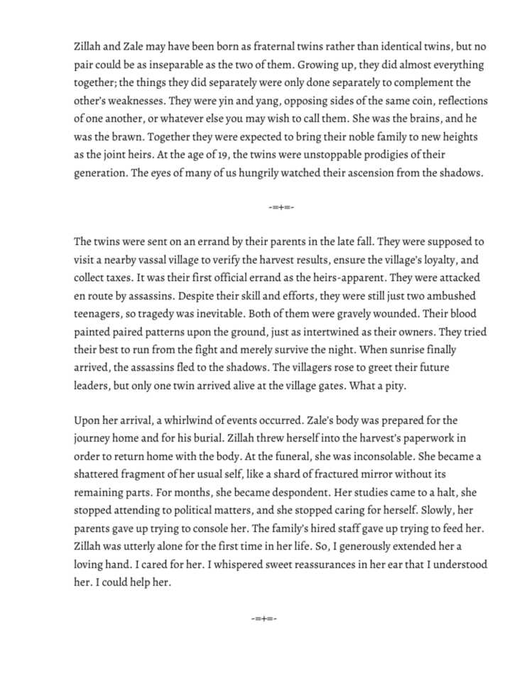 I think the concept of souls is so fascinating, especially in the context of people with intertwined fates or backgrounds. This piece was actually originally a backstory for a Dungeons and Dragons character, albeit with somewhat different ending. But I sort of combined my fun little story about tragic twin souls with the concept of a mirror monster. On that front, I was inspired by a few pieces of media. Also by those moments when you’re alone and catch a glimpse of your reflection out of the corner of your eye and it startles you.